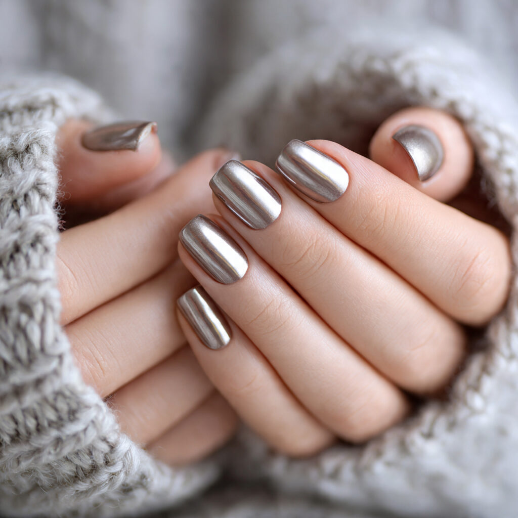 For those who favor a touch of radiance, nude chrome nails offer the perfect balance between minimalism and modern glamour. The neutral base paired with a soft metallic sheen reflects light delicately, creating a polished and contemporary look that remains effortlessly chic.