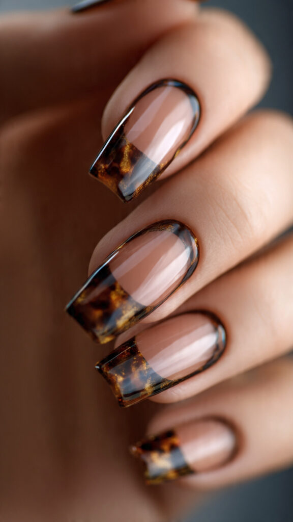 Texture meets tradition. Rich amber and brown patterns on the tips for a high-end Autumn look.